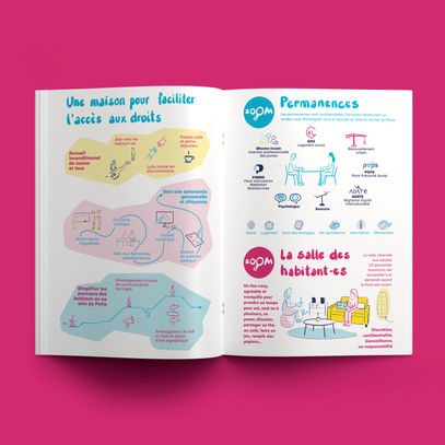 Pour chacune des dix Maisons des habitant·es (MDH) de la Ville de Grenoble, un livret de 12 pages résume en dessin le projet social de la MDH : son territoire d'intervention, ses partenaires, ses principales actions, quelques projets phares et son équipe.